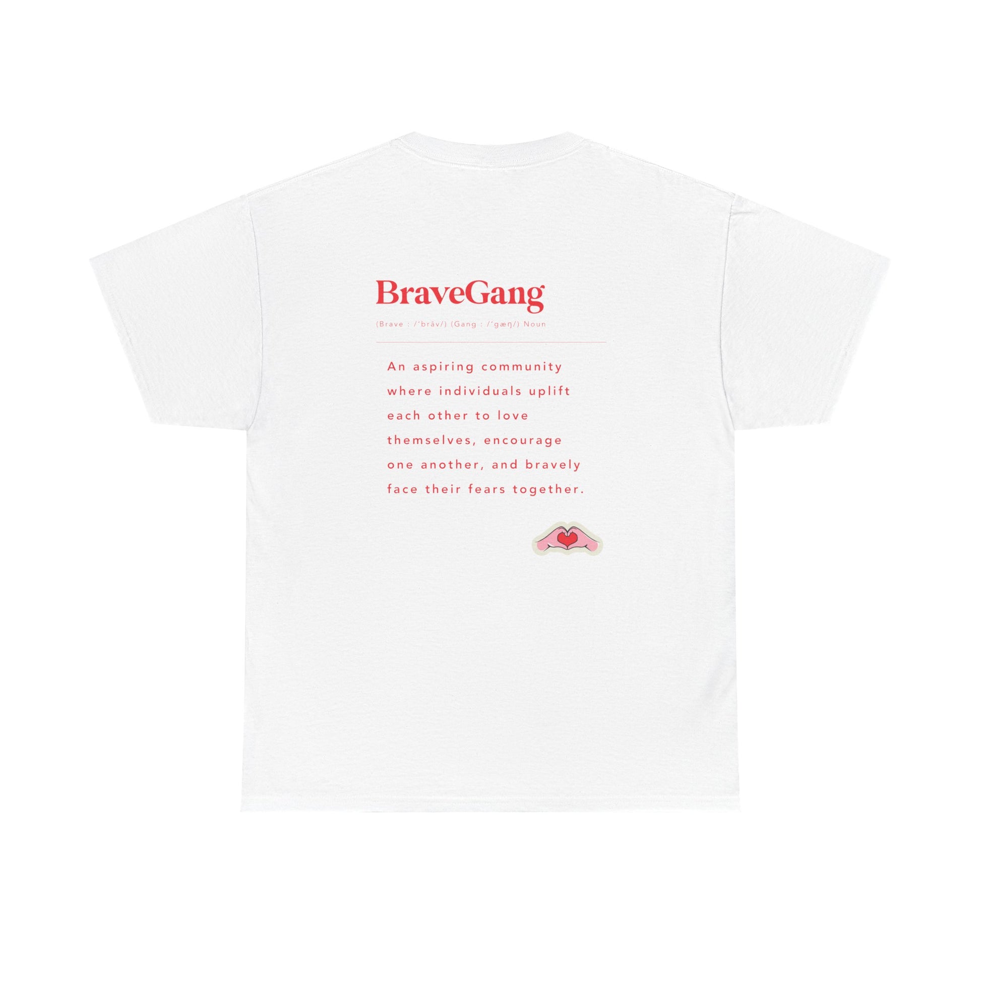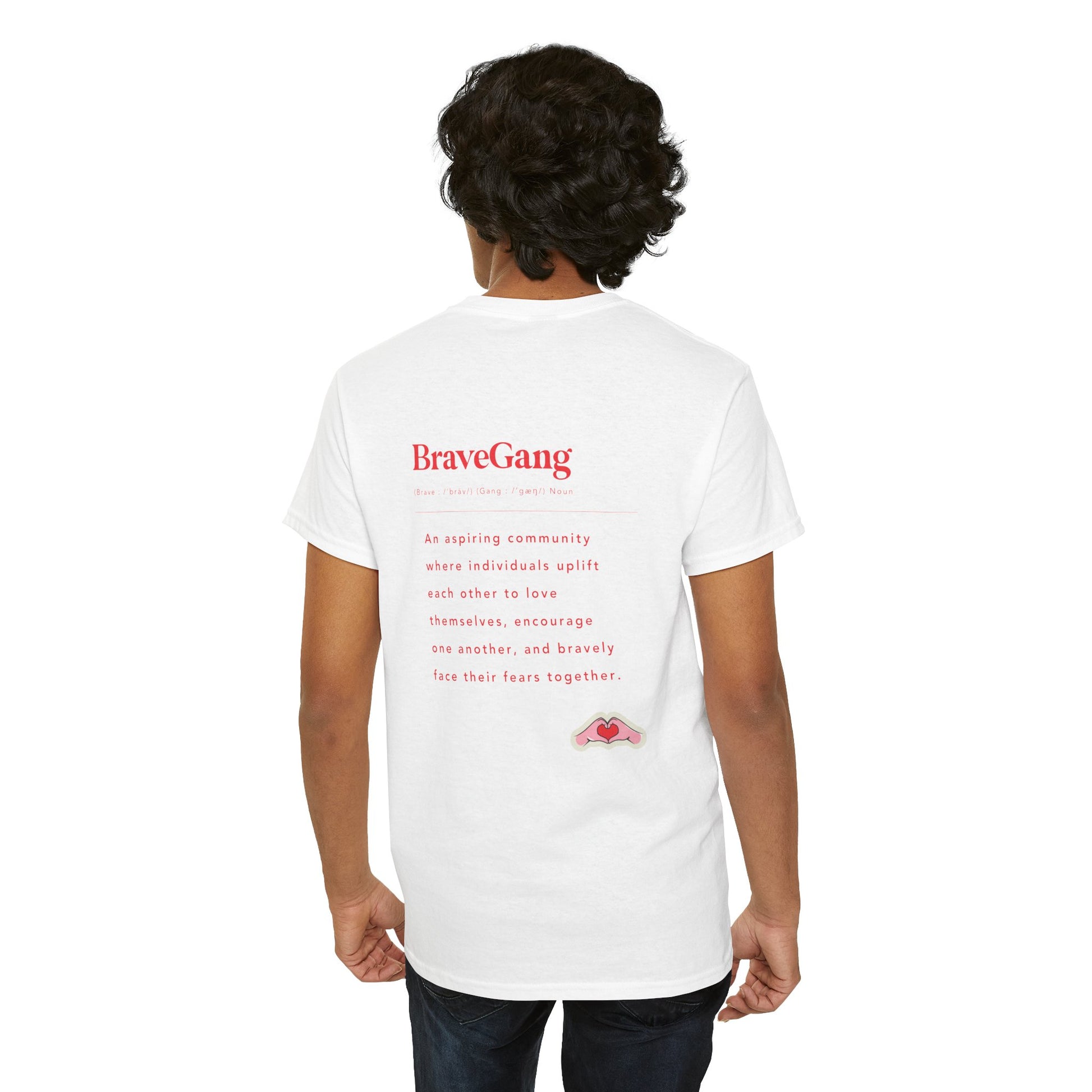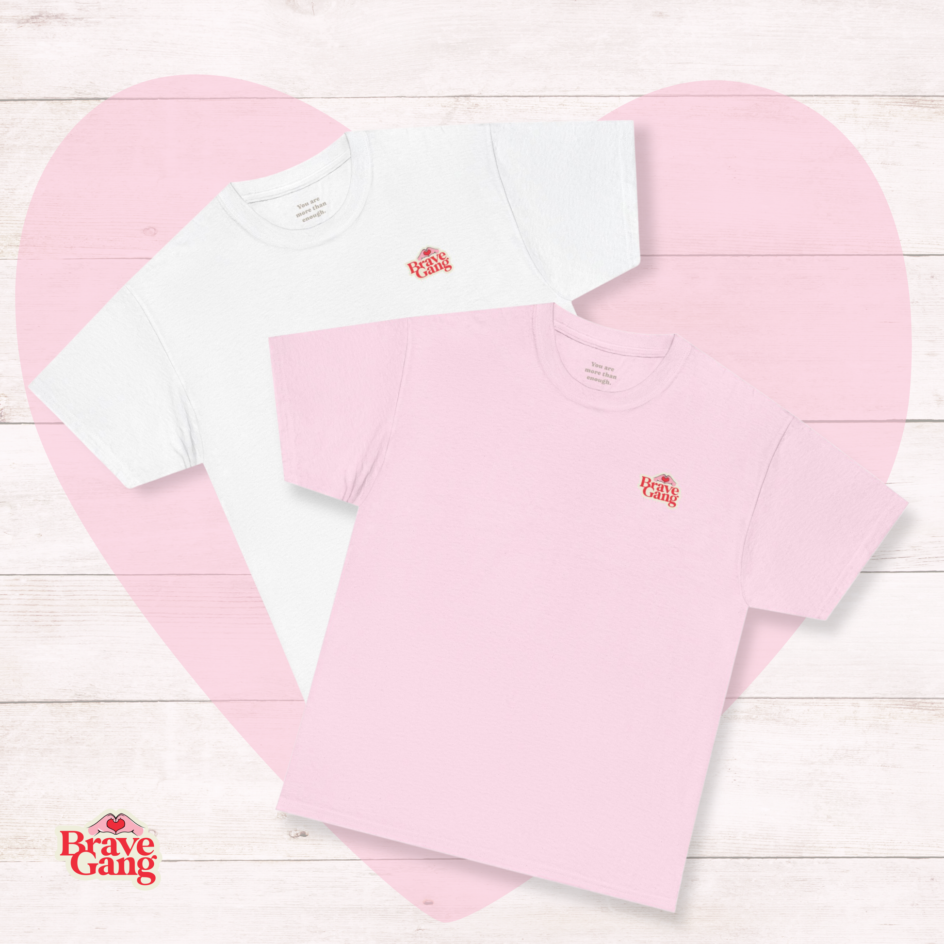 A soft, classic cotton tee that speaks quietly but with heart. 💖 This Forever Collection staple features a clean pink or white crew-neck that frames small, meaningful graphics—a subtle chest BraveGang emblem and a gentle back composition that reads like a short manifesto. The midweight cotton drapes softly, holding its shape through every wash. Thoughtfully finished with a smooth rib collar and tear-away label, it’s comfort you can count on day after day.