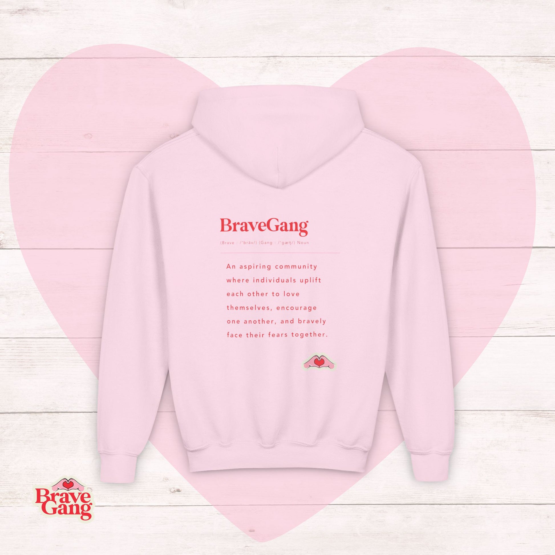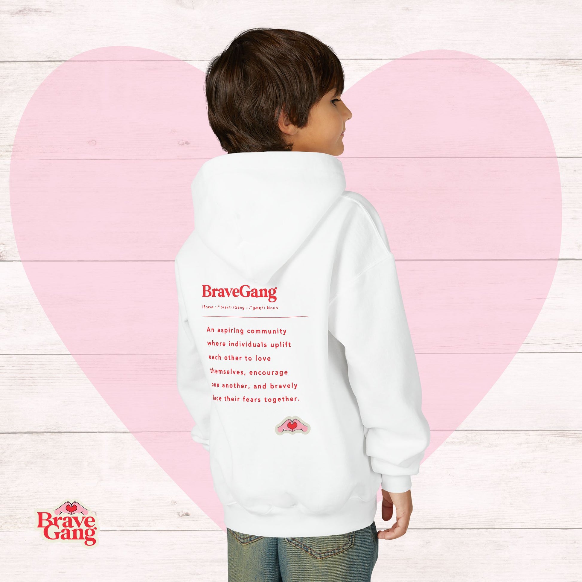 This BraveGang Youth Hoodie is designed to feel like a quiet hug—warm, comfortable, and gently encouraging. Available in Pink, Grey or White, it features a small BraveGang logo on the chest and a thoughtful message down the back, creating a subtle statement kids can carry with them through school days, playtime, and slow weekend mornings.