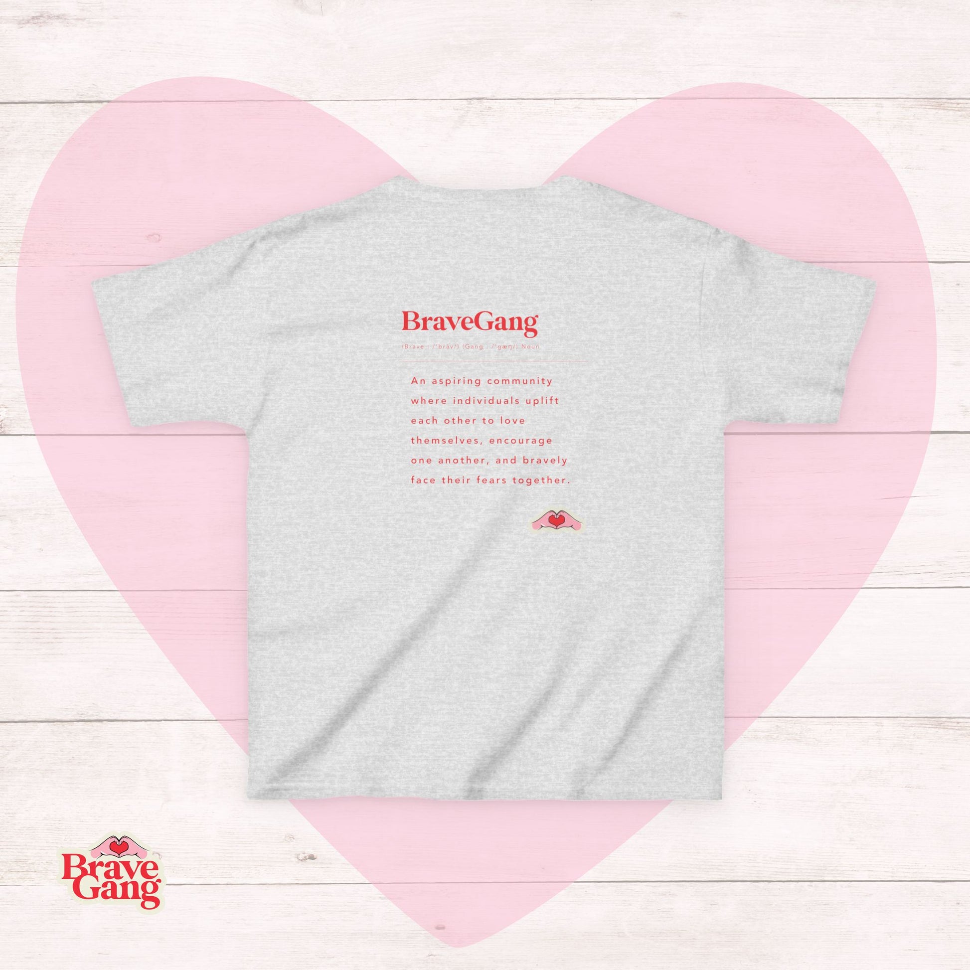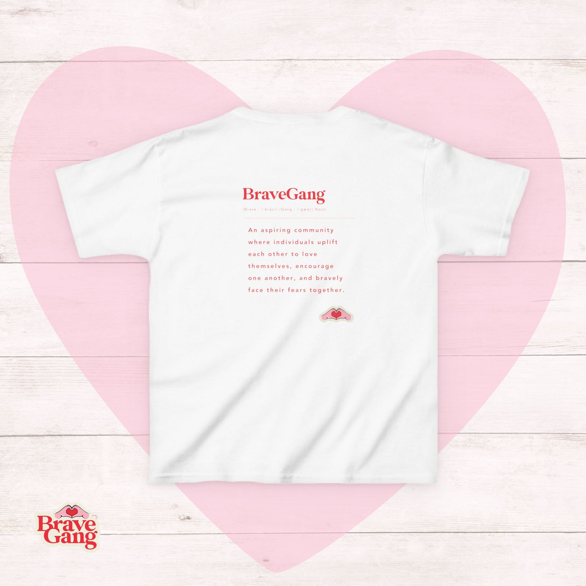 This BraveGang Kids Tee is a midweight, ultra-soft essential designed to feel lived-in from the very first wear. Available in White, BraveGang Pink, and Soft Grey, it features a tiny chest logo and a thoughtful back design that reads like a mini manifesto: brave, curious & kind.